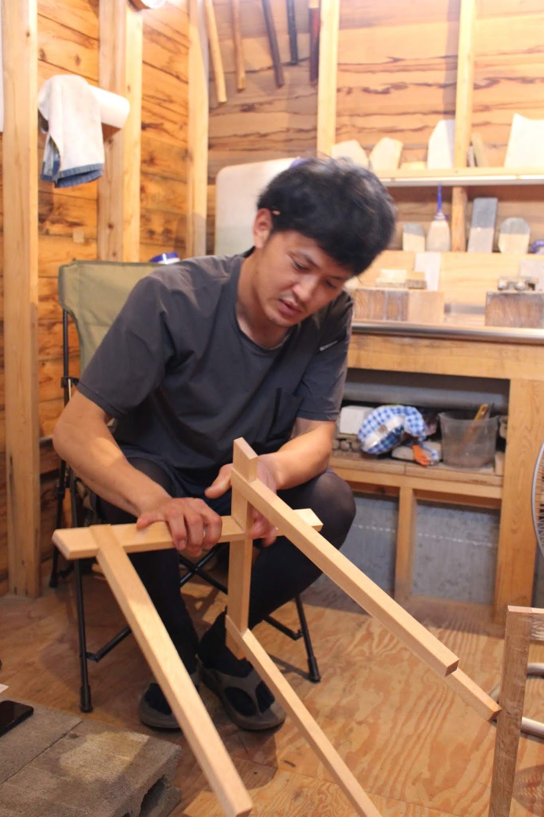 さらに、藤井さんによる改良も加わっていました。当初の設計では、脚が天板に対して直角に降りていましたが、それだとぐらつきやすいため、斜めに角度を付け、強度とバランスを向上させていました。